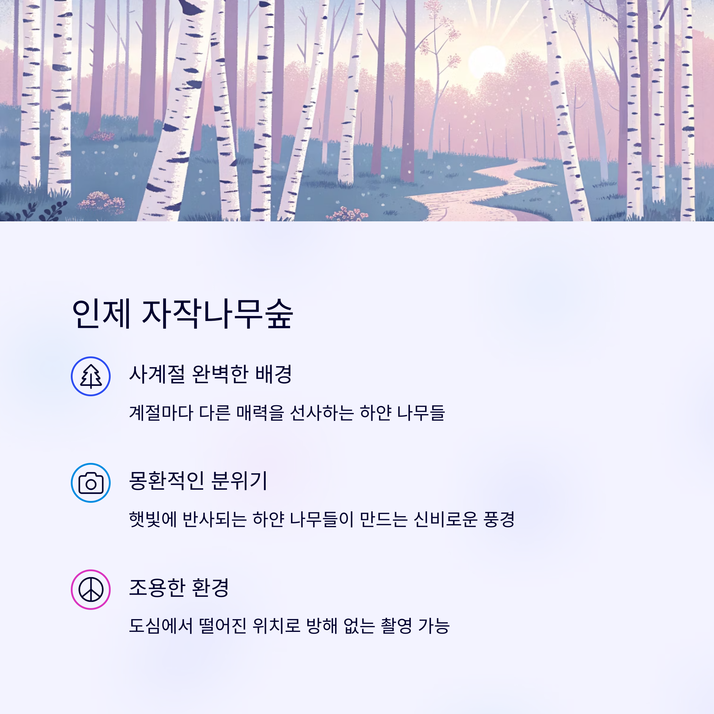 인제 원대리 자작나무숲은 사계절 모두 사진 배경으로 완벽한 장소입니다.