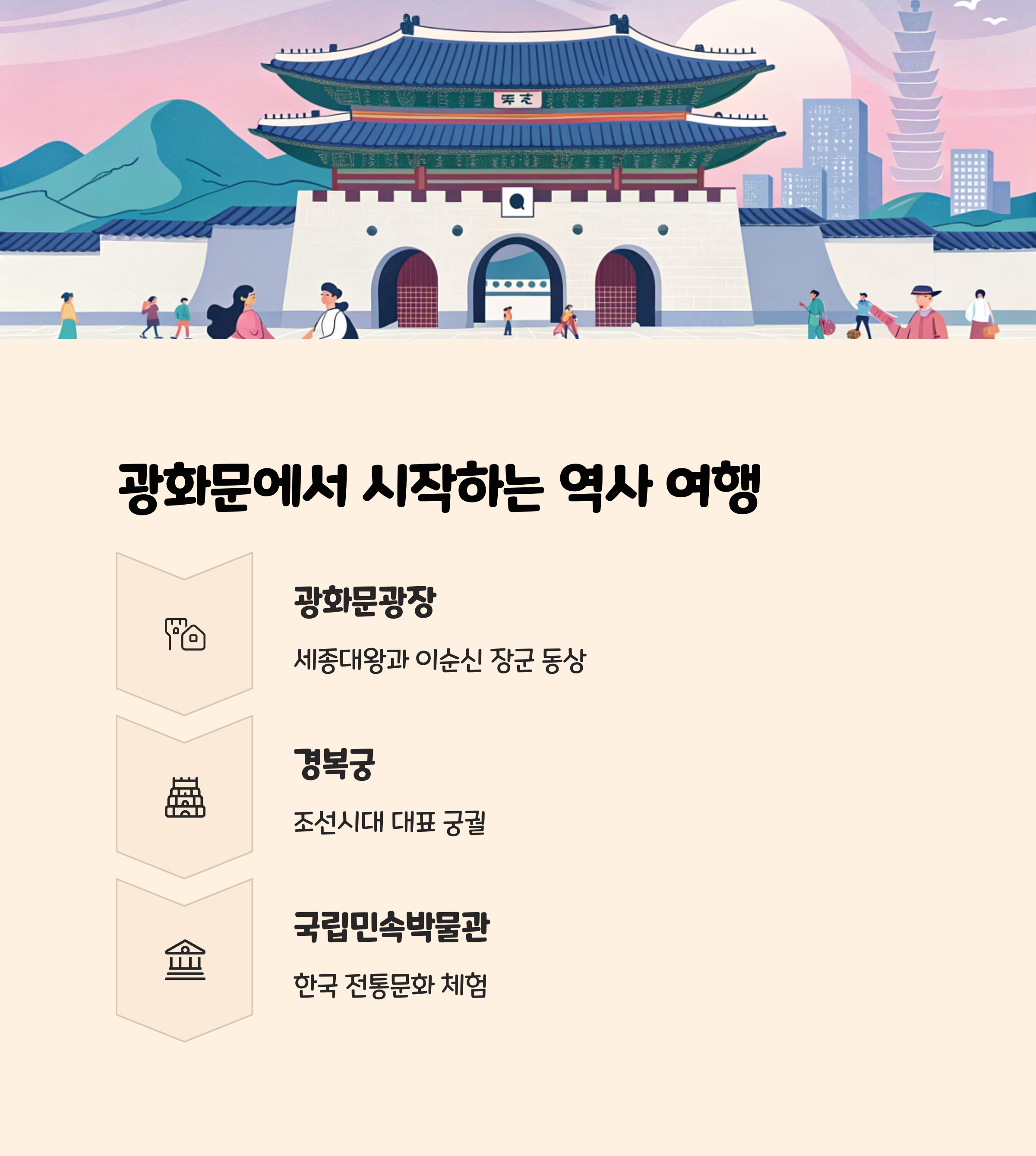 "광화문에서 출발하면 경복궁, 청계천, 북촌까지 효율적인 루트가 완성됩니다."