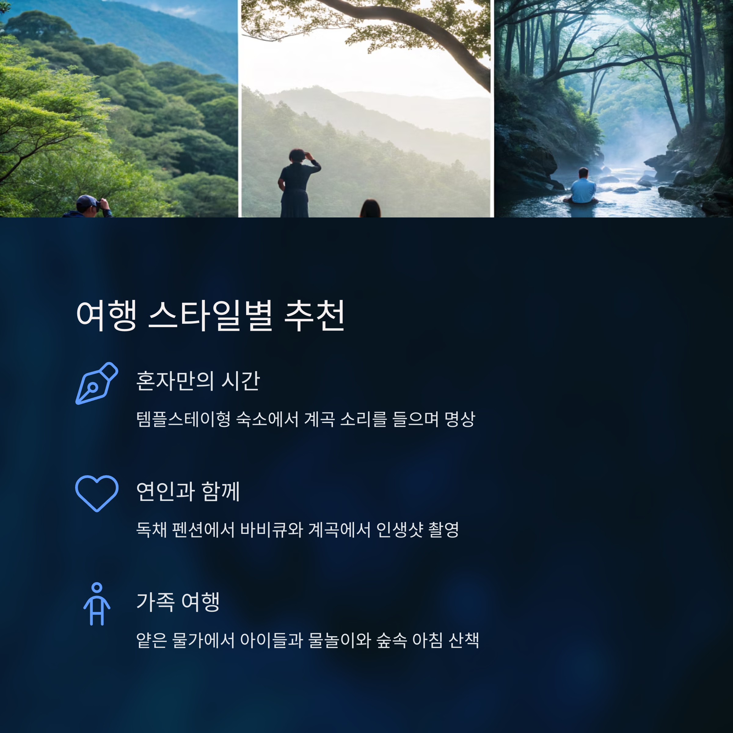 자연 속에서의 정적인 힐링과 자기 성찰을 위한 여정에 최적화된 조합입니다