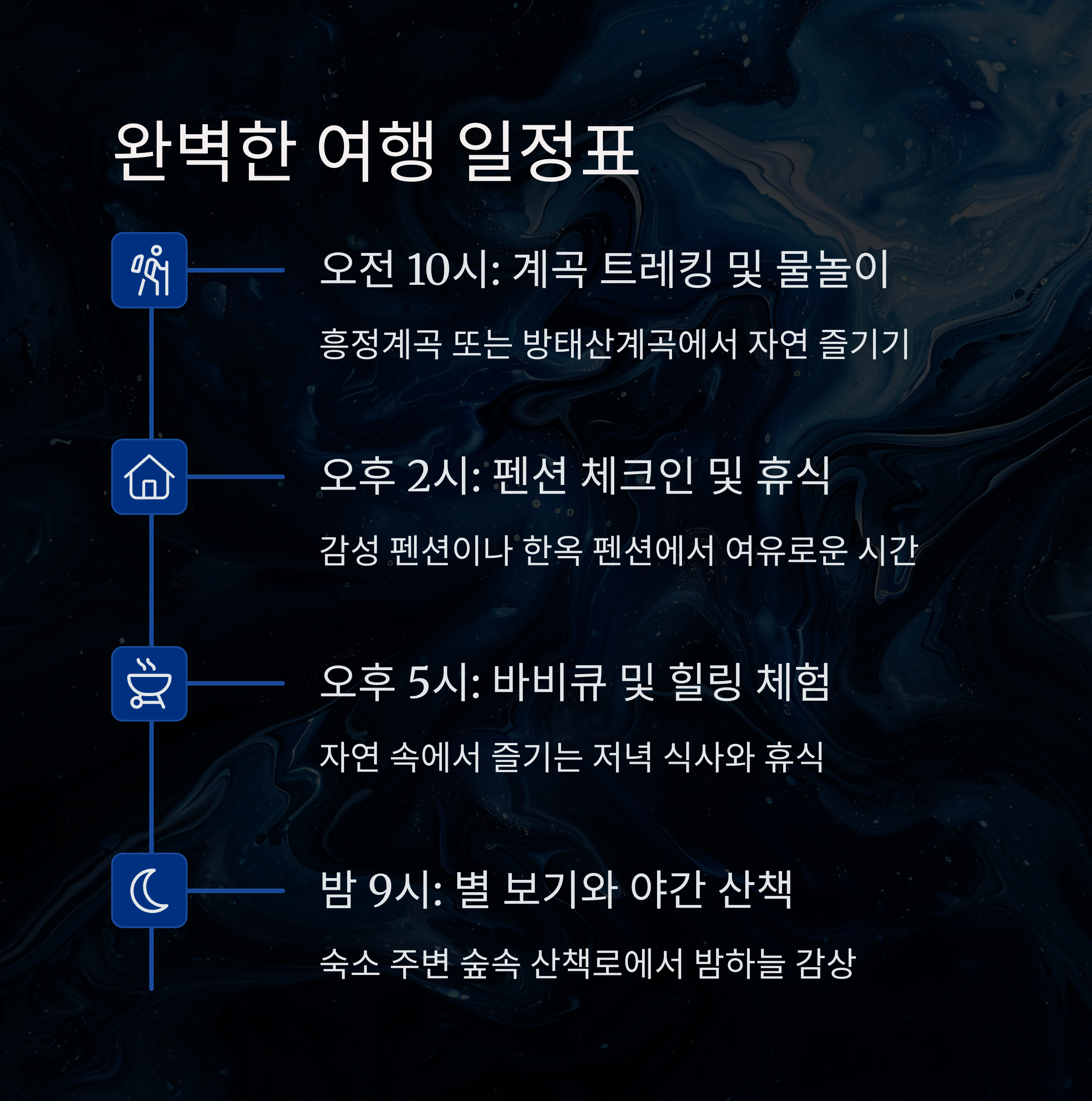 | 밤 9시 | 별 보기 / 야간 산책 | 숙소 주변 숲속 산책로 |