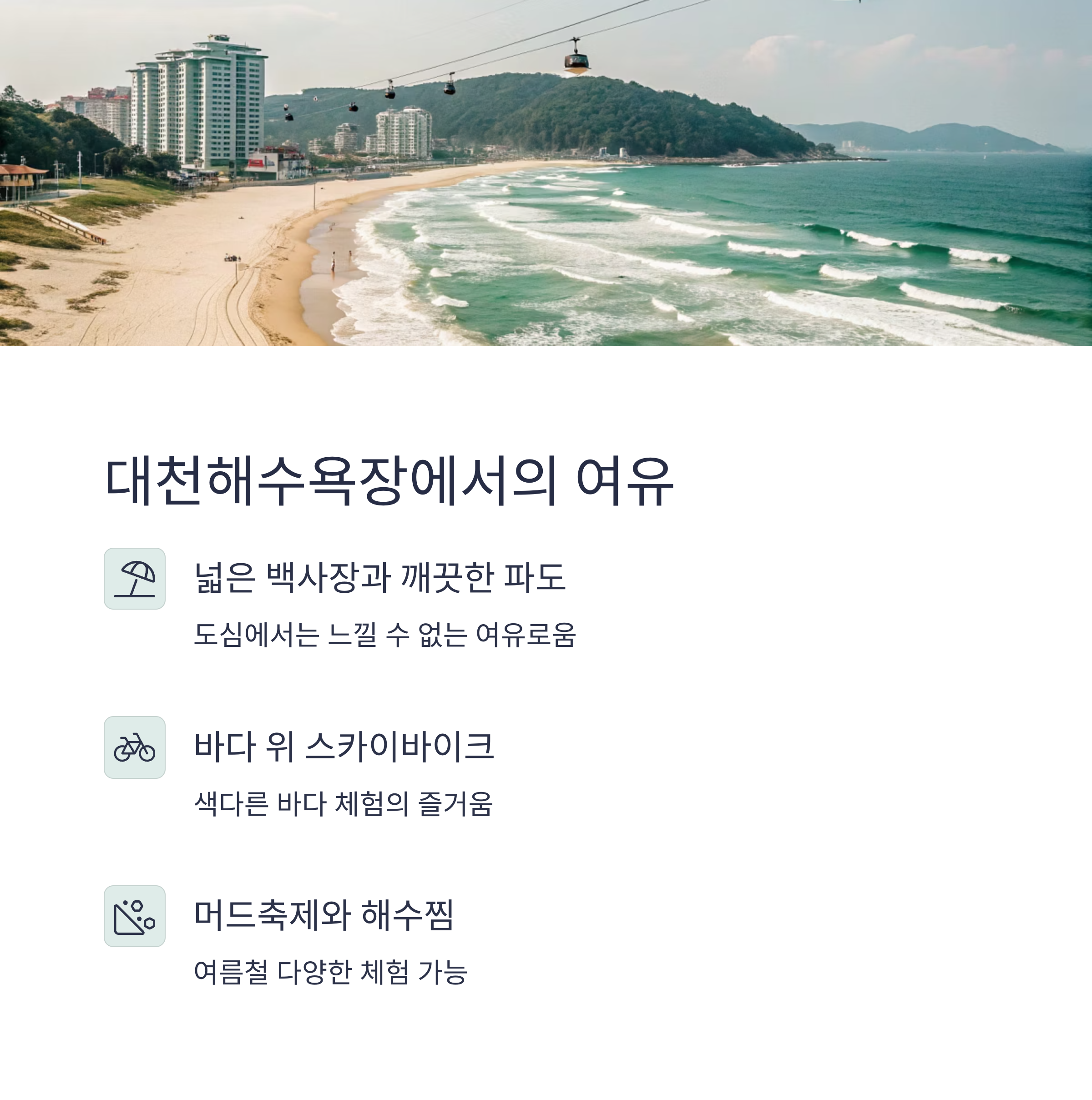 | 여름 | 해수욕, 머드 체험 | 사전 예약, 자외선 차단제 준비 |